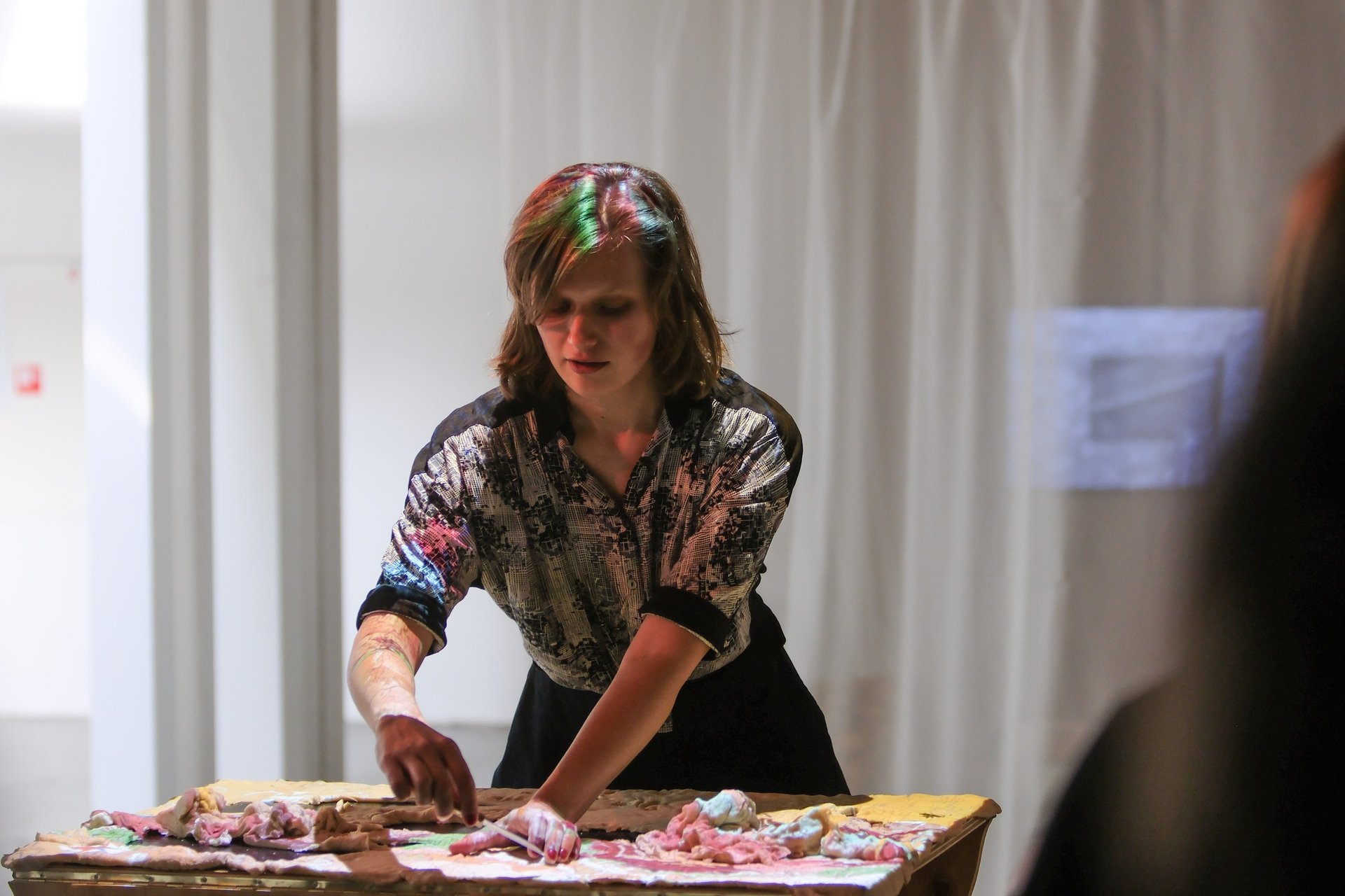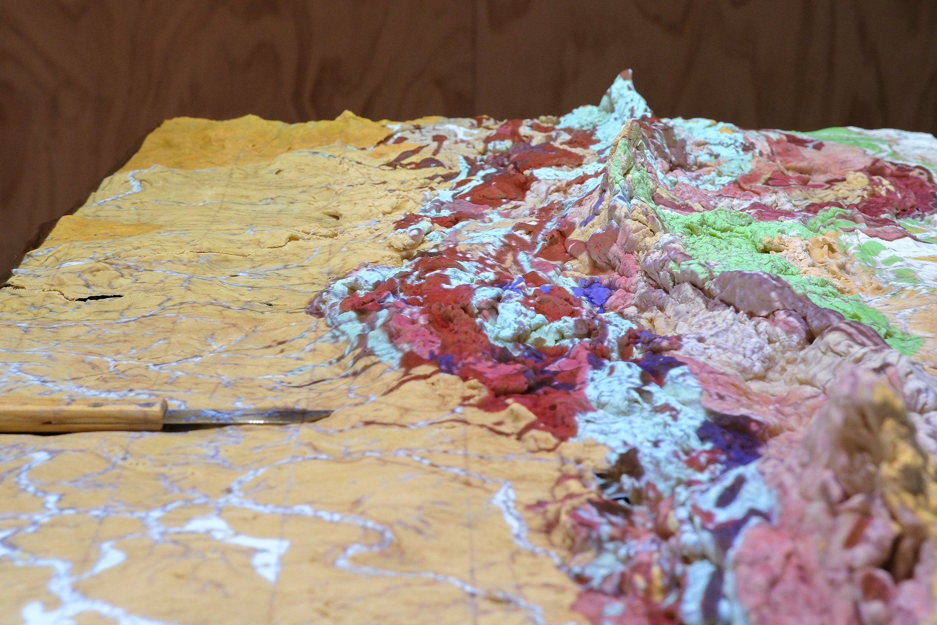 1.Taking from the table - a systematic act of cutting of the dough as landscape divided and conquered, presented in a lecture performance for a wide audience. This activation looks at the colonial history of, and impacts on the Ural region. The cutting of the dough landscape acts as a metaphor for the loss of land, ways of being and cultures that have lived here, juxtaposed with the land uses of today.