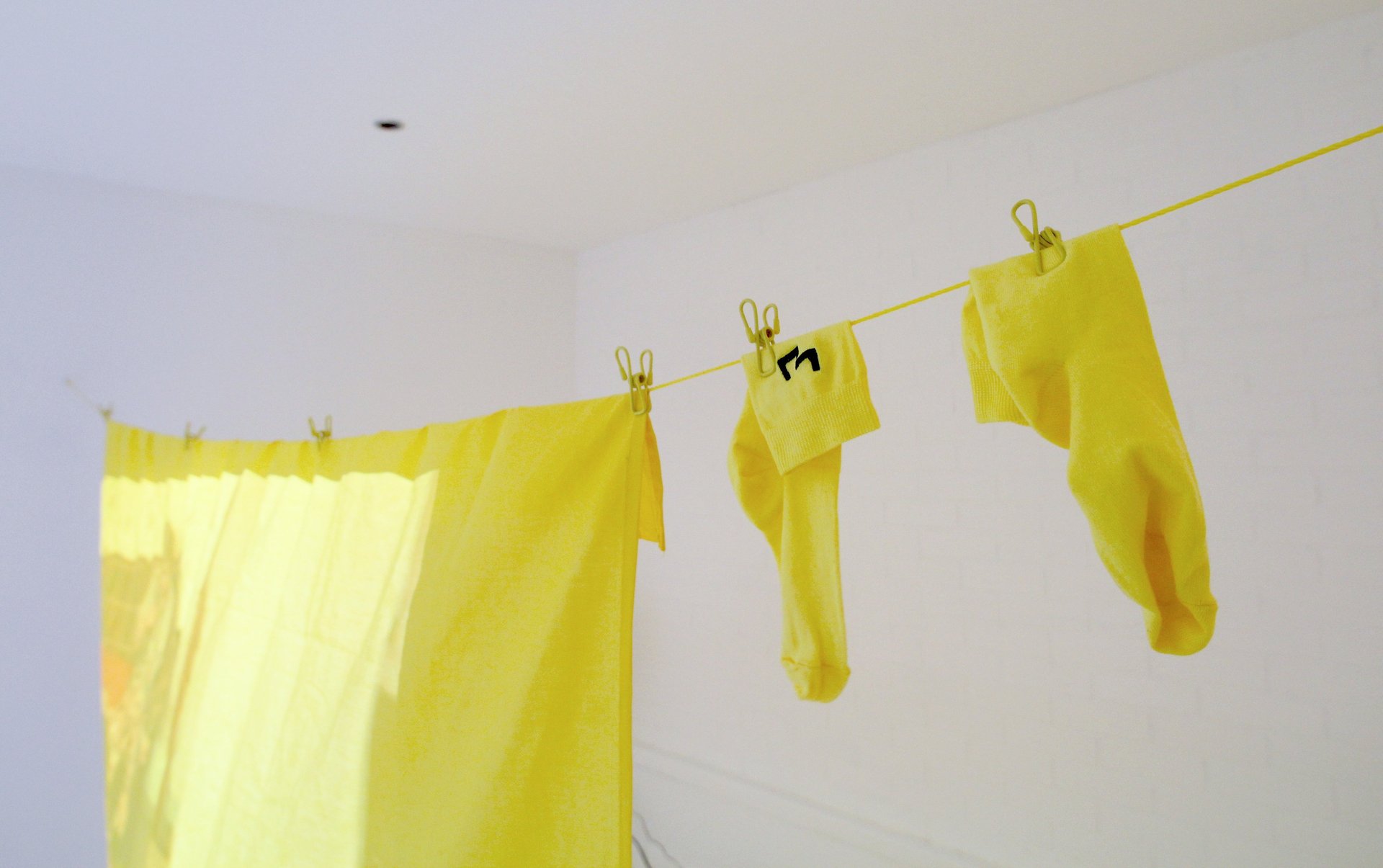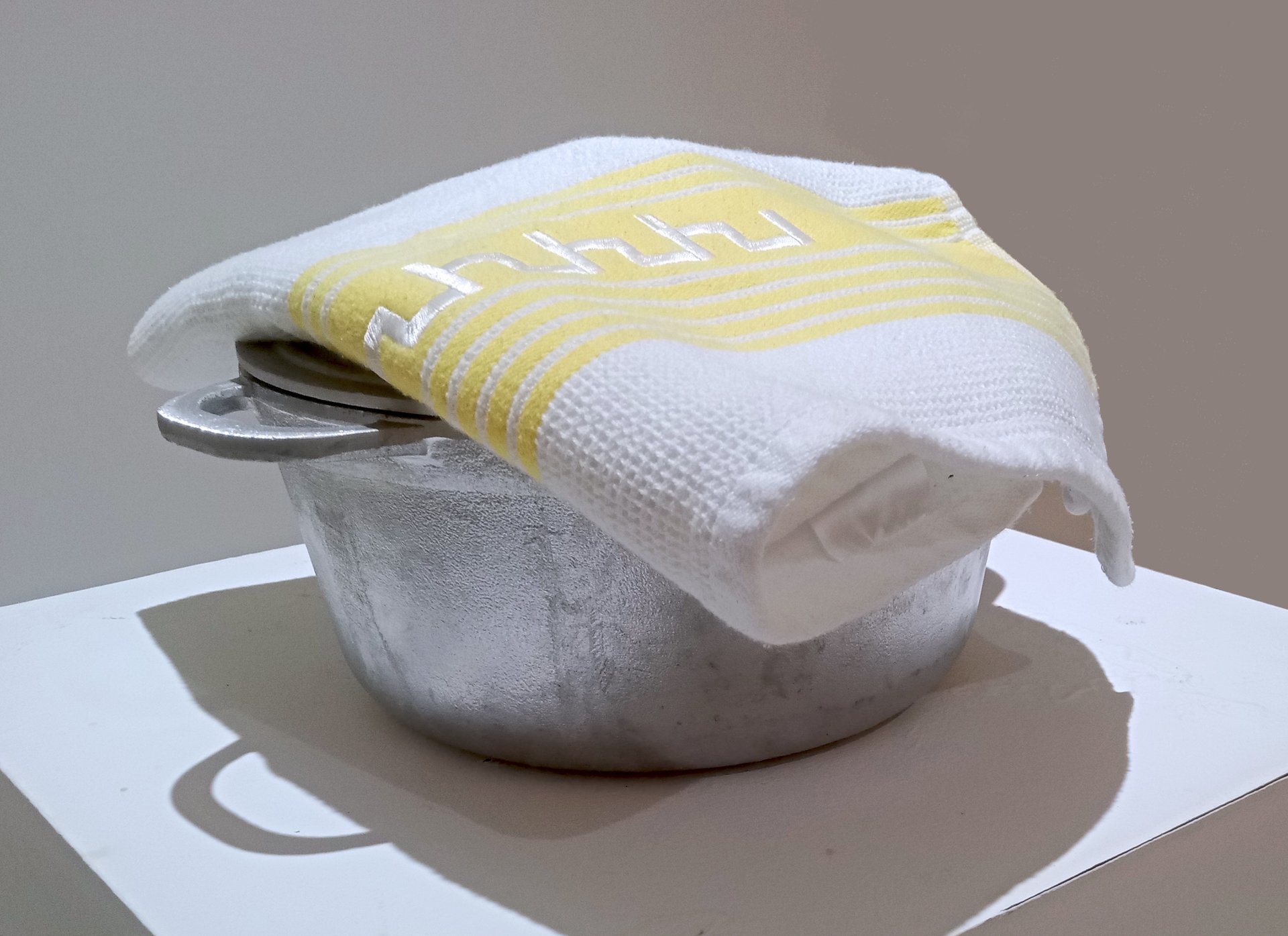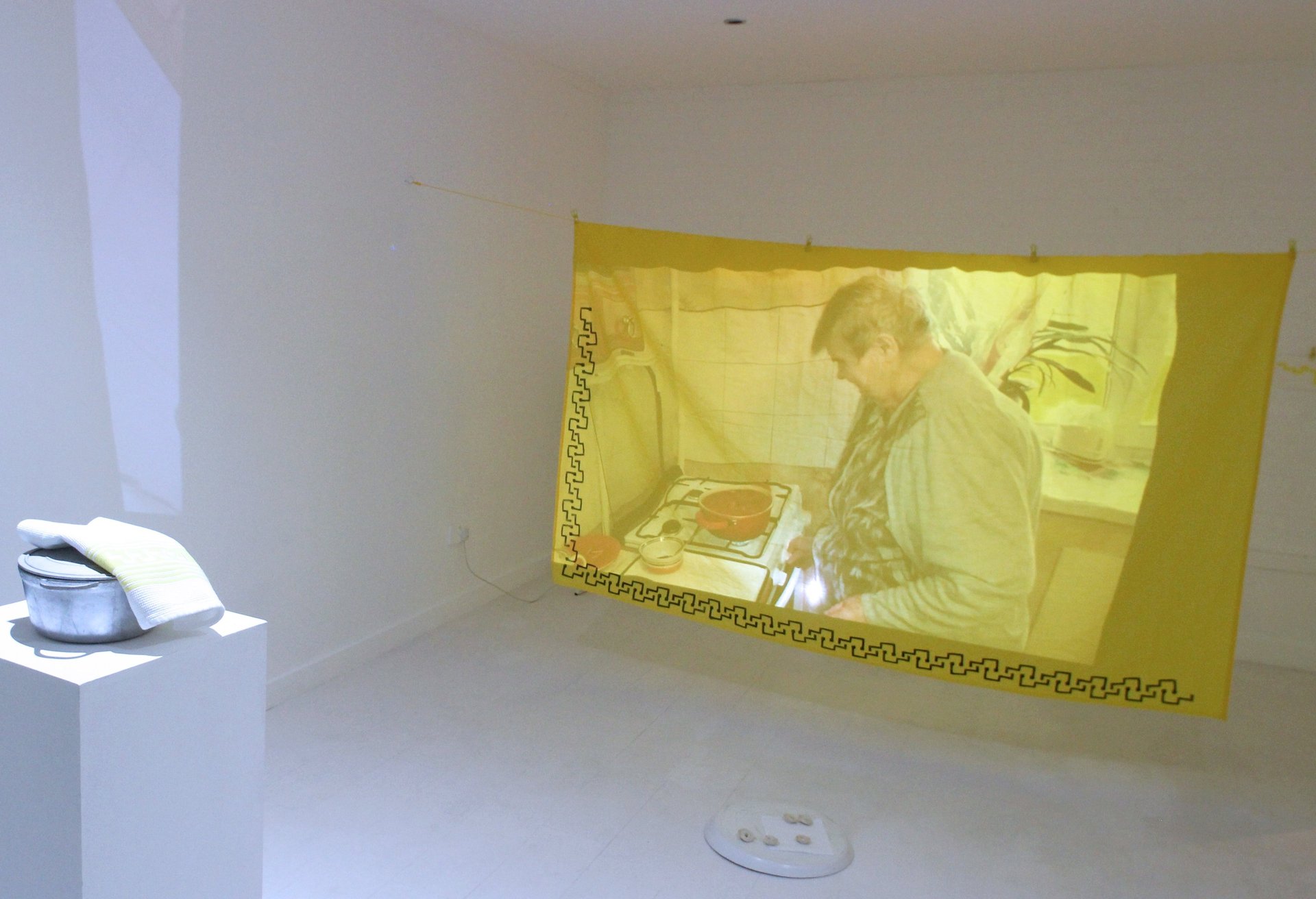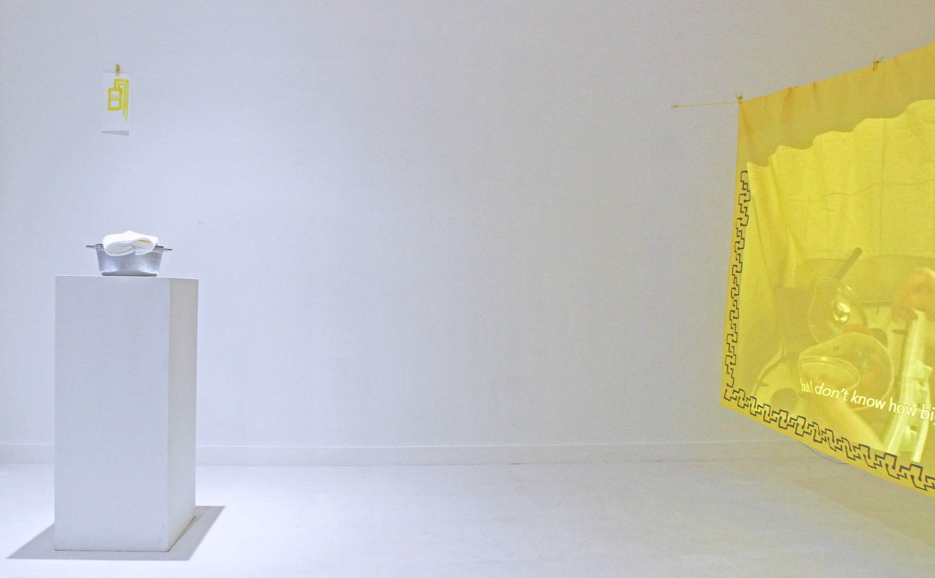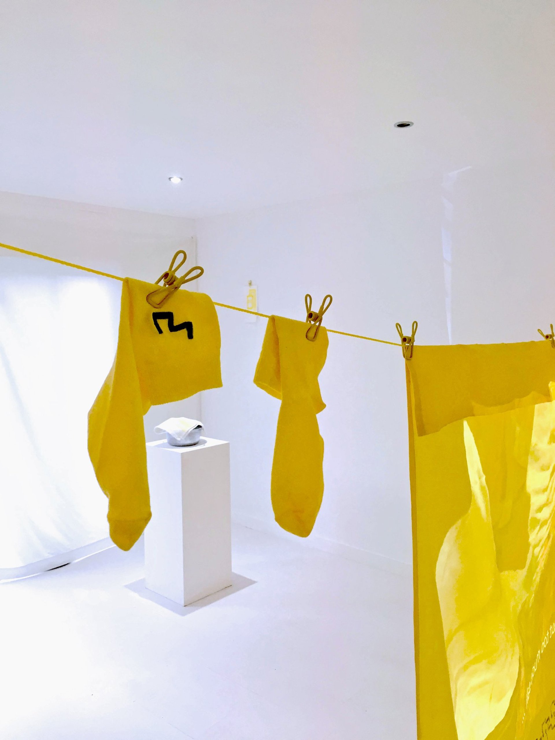The installation is full of domestic features such as the washing line; simultaneously symbolising housework and home. The laundry is hung out to dry in a home setting, but at the same time it is a (sometimes) colourful display of personal items for the passers-by in public. Generally the washing is hanging from a balcony or in your back yard where at least the glimpse of it will be seen by someone outside of your home. There they hang, with movement and life given by the breeze - completely banal but a beautiful sight. I want to celebrate this banality and many others as there is great strength and importance in it that often gets unnoticed. The borsch pot is displayed on a pedestal to highlight my grandmother's daily domestic labour. The drawings, embroidered and printed details are based on the view from the apartment, while the abundance of yellow is a homage to the colour of my grandmother's balcony.